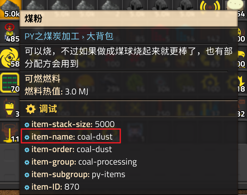 游戏中按下F4,调整设置并勾选show-debug-info-in-tooltips。随后按下F5进入调试输出界面,即可在最下方的“调试”栏处找到鼠标当前指向设施的内部名。