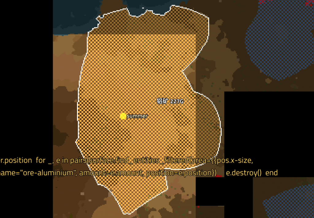 执行后,玩家周围半径200内的铝矿藏量将翻倍。也可以直接替换倒数第二行的e.amount =后的数值为自己想要的数值,例如e.amount = 1000000。或令其每一格藏量均在一定范围内随机取值,例如e.amount = math.random(800000, 1200000)