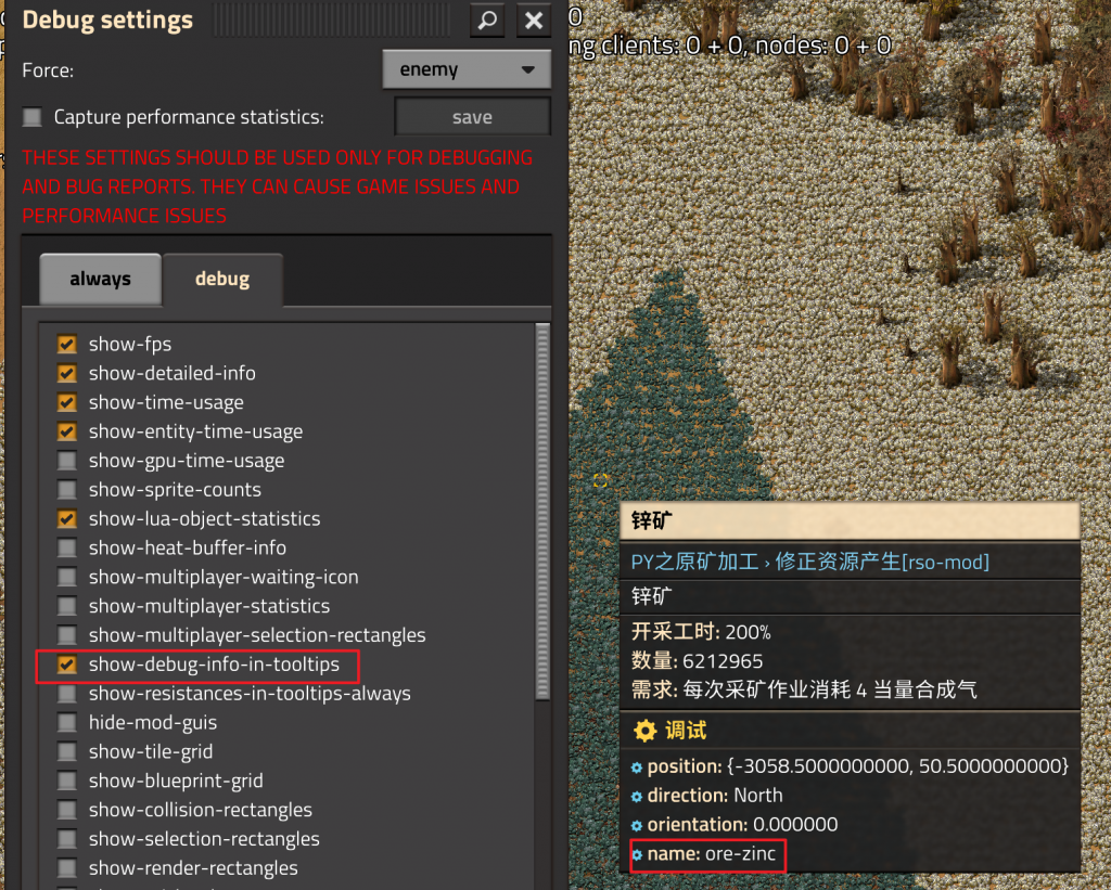 游戏中按下 F4,调整设置并勾选 show-debug-info-in-tooltips。随后按下 F5 进入调试输出界面,即可在最下方的 “调试” 栏处找到鼠标当前指向矿物的内部名。
