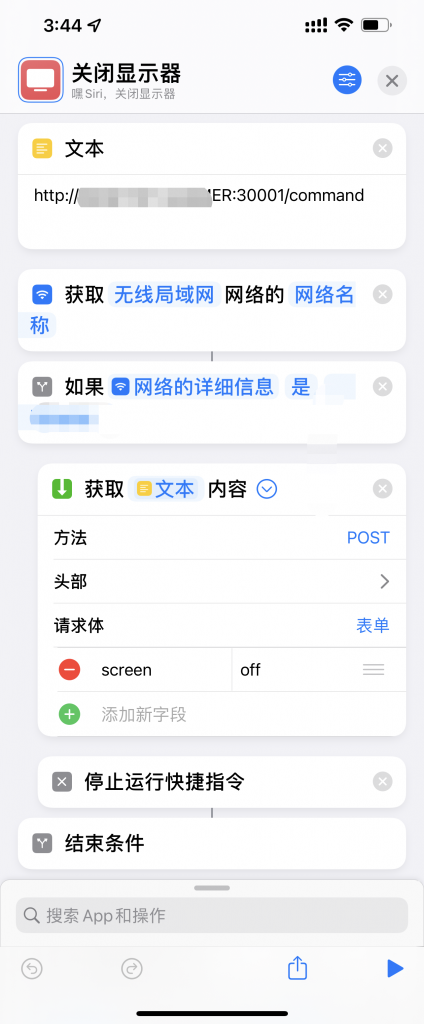 在IOS的快捷指令中按照如图所示进行设置,通过HTTP请求将screen=off参数Post至PC的30001端口即可触发软件中写好的指令,通过发送消息关闭显示器。
